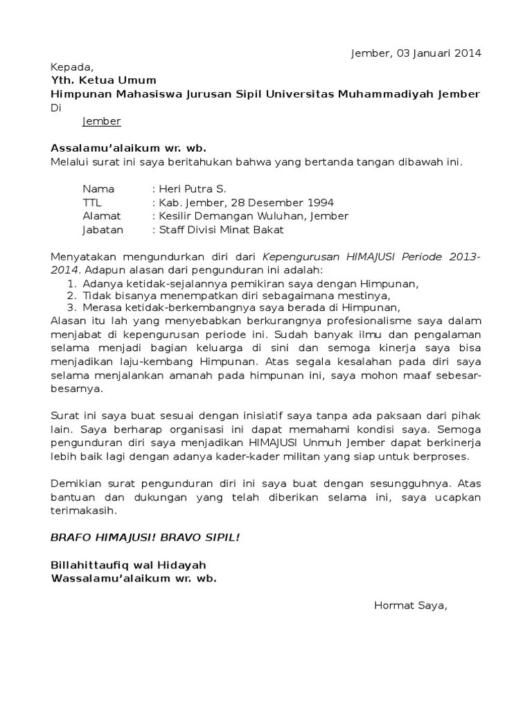 Melalui surat ini, saya sampaikan maksud saya untuk mengundurkan diri sebagai ketua pelaksana. Misalnya lingkungan serta budaya kerja yang tak sesuai dengan karakter kamu, besaran gaji yang tak sesuai dengan kerjaan yang diberikan oleh perusahaan, karna. Entah bagi yang ingin resign dari tempat kerja di perusahaan yang selama ini ia bernaung di bawahnya atau dari jabatan tertentu. Tak lupa saya berharap semoga hmi selalu maju dan aktif mendukung kemajuan. Setelah membaca beberapa tips mengenai surat pengunduran diri, di bawah ini terdapat.
